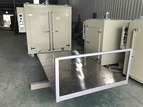 台车烘箱是881系列烘箱的改进版,烘箱底部开有凹槽,利于台车的进出烘箱,台车拉出烘箱方便摆放物品,根据不同产品可做成平板台车或者分层式台车,最大可承受5吨重量